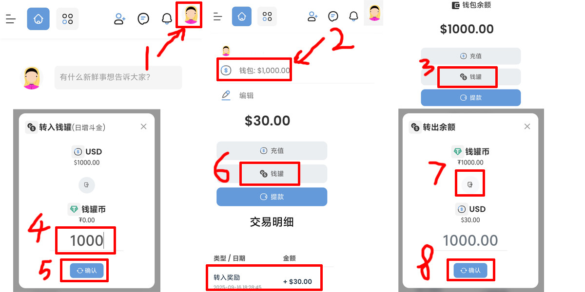 第一,将1000美元全部转入钱罐。查看钱包到帐奖励30美元后又马上把1000美元转出到钱包。( 方法:点击右上角自己的头像---钱包---钱罐---输入1000---确认。然后返回钱包查看奖励到帐,再点击钱罐点击中间那个互换按钮确认转出余额。