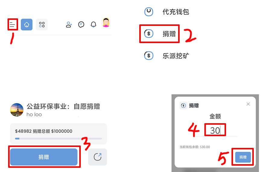 第三,完成申购后马上点击赎回,再到平台首页菜单找到 捐赠 ,找到公益环保事业后点击捐赠按钮,输入1058美元(一定要是1058这个金额),再确认就可以。如下图