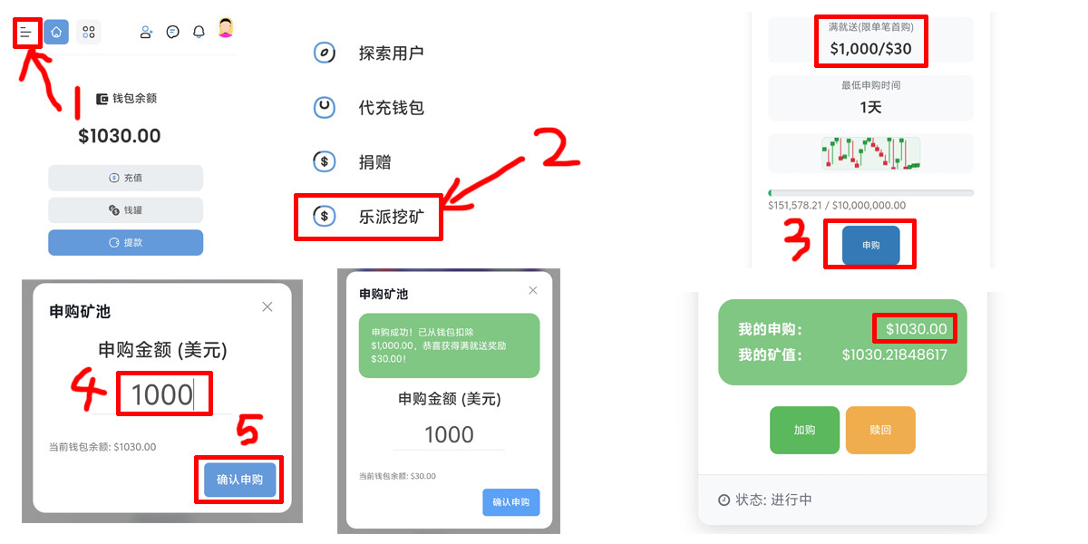 第二,到平台首页左上角菜单里找到乐派挖矿,找到单笔满1000送30的矿池,然后直接申购1000美元。申购成功后马上赎回,如下图