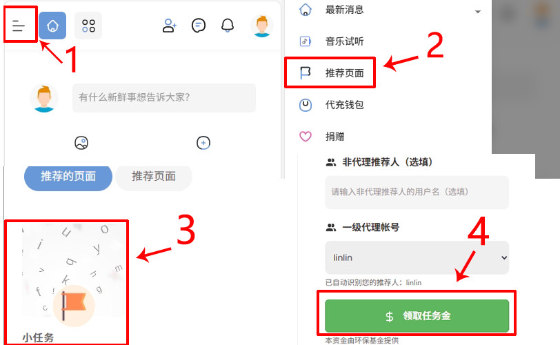 2、代理。如果你已经成为了代理,那你在推荐别人注册时,在推荐人一栏一定要填你自己的用户名。然后你推荐的用户在领取任务金时,非代理推荐人(选填)不要填,留空,切记。
