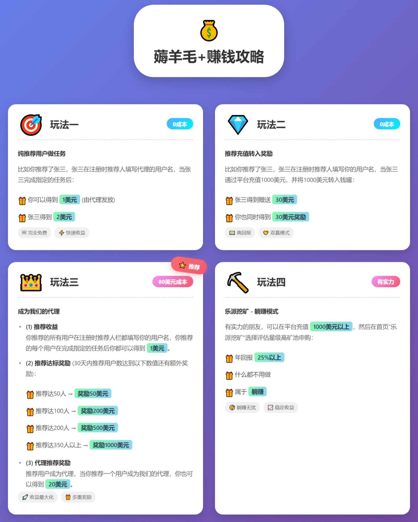 1、非代理。如果你还不想成为代理,那你推荐别人注册时,在推荐人一栏留空,然后你推荐的用户在领取任务金时,非代理推荐人(选填)这一栏一定要填你自己的用户名,这样当你推荐的用户完成任务后你就可以获得1美元。